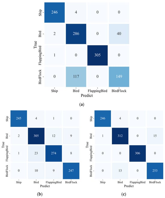 From Figure 16, it can be seen that the misclassification in testing sets is mainly concentrated between birds and bird flocks. Additionally, the classification accuracy of different targets varies. Firstly, whether using RGB three-channel Doppler spectrograms or RGBA four-channel Doppler spectrograms on ResNet34 or using RGBA four-channel Doppler spectrograms on ResNet34_CA, the classification performance of ships remains stable. This stability is due to two advantages of ships: first, ships have distinct differences in maneuverability, primary spectrum amplitude, and width compared with birds; second, the stability of these parameters over time is much stronger for ships than for birds. Among the three bird categories, the number of classification errors between birds and bird flocks is the most significant, while the classification accuracy for flapping birds is noticeably better than for the other two categories. This is because flapping birds have distinct micro-Doppler signatures that, when captured by the network, can effectively distinguish them from the other two bird categories. The errors in classifying birds and bird flocks can be attributed to several factors: first, the radar reflection intensity of birds and bird flocks may be similar, especially at greater radar distances. Secondly, the limited spatial resolution of the radar may prevent it from accurately distinguishing multiple closely spaced targets. Finally, the overall movement patterns of birds and bird flocks may be very similar, particularly in terms of maneuverability.