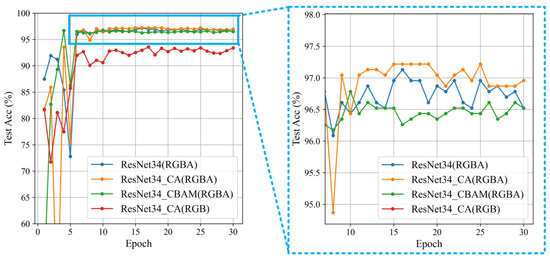 Building on the comparison of RGBA four-channel Doppler spectrograms classification using the ResNet34 backbone network in the previous section, this section integrates the CA module into the residual blocks of ResNet34, forming the ResNet34_CA network. Simultaneously, the convolutional block attention module (CBAM) [36] is incorporated into ResNet34 in the same manner, resulting in the ResNet34_CBAM network. This section uses RGBA four-channel Doppler spectrograms as the network input to compare the classification effects.