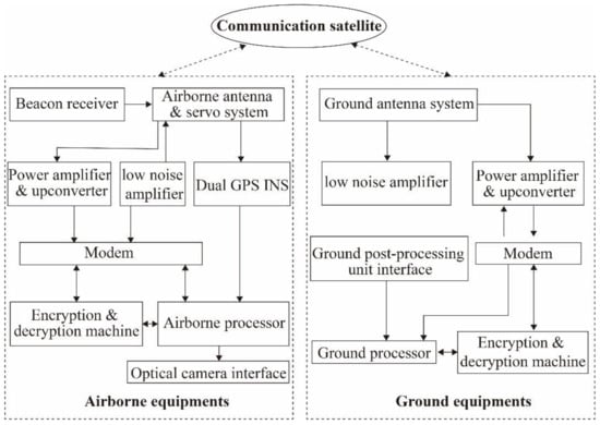 However, although the image resolution obtained by aerial remote sensing is relatively high, due to the fact that airborne cameras are generally ordinary digital cameras with small image frames, a large number of images are obtained with significant image distortion []. Moreover, due to the large tilt angle, irregular tilt direction, and large amplitude of turbulence during shooting, there are differences in scale and rotation between adjacent images []. Chen et al. (2017) adopt a combination of oblique and vertical shooting methods to improve this problem [], while others use image correction techniques on the images obtained by the aviation platform for detailed monitoring of natural hazards [,]. Additionally, the inertial stabilization platform is used to isolate the influence of aircraft carrier angular motion, vibration, etc. on the load visual axis, which is the basis and guarantee of high-precision aerial remote sensing imaging []. Regarding the aerial remote sensing platform, in addition to the continuous improvement of imaging technology, its data transmission stability and speed are also key performance factors affecting disaster rescue. The use of aerial remote sensing to obtain these observations is attractive, but often challenged by lack of suitable solutions to get live images back to decision makers []. In previous cases, the images were mostly read and interpreted after landing [,,,]. The aerial remote sensing platform may be beyond radio line of sight during flight, so its communication cannot rely solely on ground communication. Satellite communication is essential to ensure real-time acquisition of observation results from aerial remote sensing platforms []. At the beginning of aerial remote sensing applications, the bandwidth of satellite communication was relatively low and could not meet the real-time transmission requirements of high-definition remote sensing images. With the development of technology and the growth of application demand, the proportion of constellations used for satellite communication and earth observation is increasing, currently even reaching 68% []. In recent years, microsatellites are mainly used for earth observation and remote sensing, and large satellite constellations make many simultaneous and distributed measurements or observations possible, such as for disaster monitoring, and increase temporal resolution of collected data [,]. Moreover, the use of higher frequencies than the S-band (mainly for telemetry) and X-band (for data transmission), such as the Ku-, K-, and Ka-bands, has become more widely available, which allows higher data rates [,]. These are the latest technologies for large spacecraft and enable real-time transmission and acquisition of high-definition photos and videos required for disaster emergency response, but they are still emerging technologies in the field of small aerial remote sensing platform.