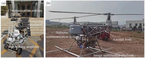 Photos of the testing systems. (a) The carrier of the mobile communication system in the ground test. (b) The system composition in the flight test.