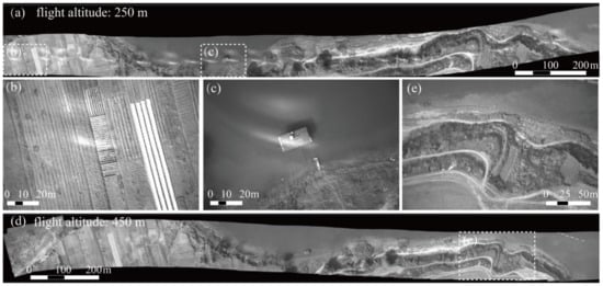 Image acquisition and stitching at flight altitudes of 250 m (a–c) and 450 m (d,e) during the Nanpingba Island flight test. (b,c) are enlarged partial views of (a), and (e) is an enlarged partial view of (d).