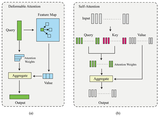 Illustration of the different attention modules. (a) Simplified architecture of the deformable attention module. (b) Simplified architecture of the self-attention module.