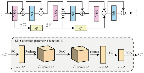Skip-attention [22], introduced in 2023, enhances the computational efficiency of the vision transformer (ViT) [26]. As shown in Figure 3, this module approximates the output of the MSA from the preceding layer using a simpler module . This module reduces computational redundancy without compromising on model performance.