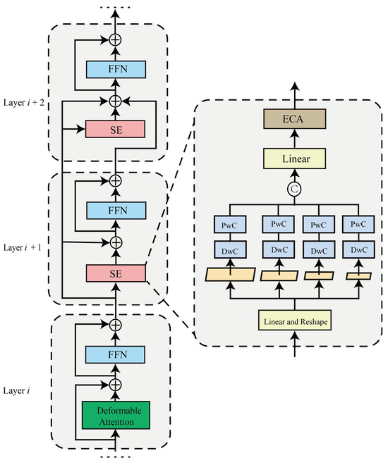 - Transformer Encoder: The encoder consists of six layers. In our experiments, the proposed SE module mainly replaced the deformable attention module [8] in the 4th, 5th, and 6th encoder layers of DINO [13], which resulted in optimal performance. The other encoder layers are consistent with those of DINO [13], adopting the deformable attention module [8] instead of the MSA module [7].