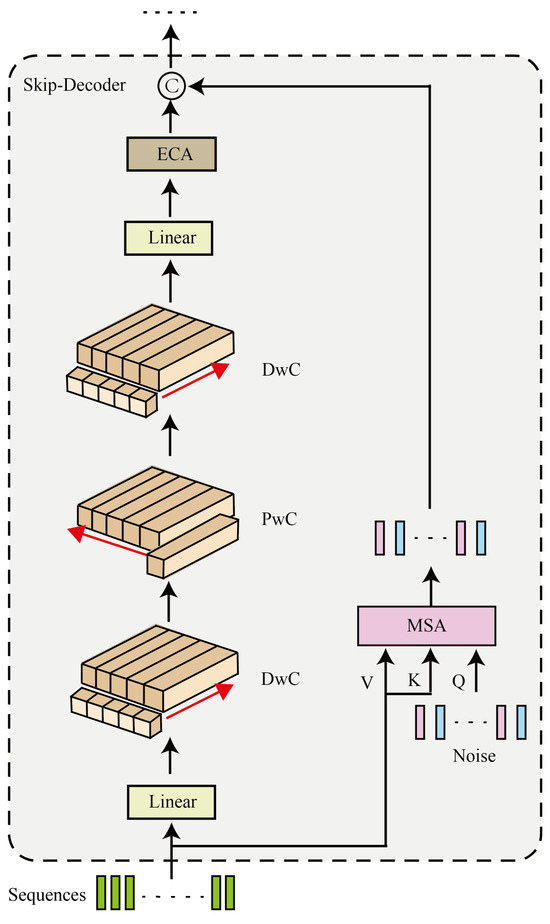 As illustrated in Figure 5, the SD module separates the input sequence data and noise data during the decoder stage. First, the sequence data are passed through a linear layer to double its original dimension. Then, the sequence data are treated as 2D data with a width of 1 and a height equal to the sequence length, and DwC and PwC [27] are performed on the 2D plane. In this case, DwC [27] is equivalent to exchanging information between single dimensions of the sequence data, and PwC [27] enables the exchange of information within the dimensions of a single vector itself. This allows for exploring information across all data in the sequence without adding any extra artificial information. We also use an additional DwC [27] to enhance the degree of information exchange between different vectors. Finally, we restore the original dimensions through a linear layer and use ECA [28] to achieve information exchange on the dimension.