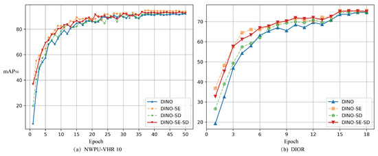 Finally, as shown in Figure 9, we analyzed the influence of the SE and SD modules on the model’s convergence time. We observed that both on the smaller-scale NWPU VHR-10 dataset and the large-scale DIOR dataset, the SE and SD modules significantly enhance the convergence speed.