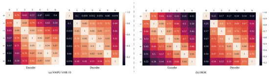 First, as shown in Figure 10, we can observe that, whether it is the NWPU VHR-10 or the DIOR dataset, and whether it is the encoder stage or the decoder stage, there are areas of high correlation. This indicates sufficient computational redundancy in the architectural design of DINO. Specifically, during the encoder stage, we can see that there is a high correlation between the second to fourth layers corresponding to one to four and between the fourth to sixth layers corresponding to three to six. However, compared to the encoder stage, during the decoder stage, although the CKA similarity [29] can also indicate which specific decoder layers have high correlation, it is not accurate enough. As shown in Figure 11, in the output of each decoder layer, most of the vectors typically correspond to redundant boxes with low category probability scores, which can affect the accuracy of CKA similarity [29]. Therefore, in the use of the SE module, we mainly selected the encoder layers with high CKA similarity [29]. For the SD module, we primarily considered the CKA similarity [29], the Pearson correlation coefficient of the heatmap for boxes with high probability, and the trade-off between the combined use of MSA [7] and the SD.