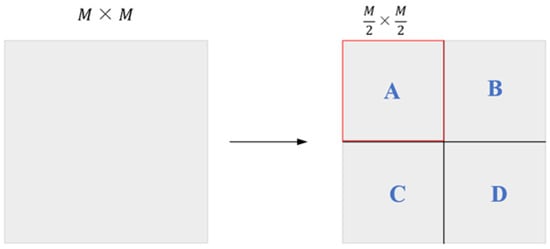 First, the W-MSA module uniformly segments the input feature maps, which are in size, into small windows, each in size, as illustrated in Figure 4 (among them, A, B, C, and D represent the four small windows obtained after segmentation). Next, MSA attention calculations are conducted within each small window to capture local details.