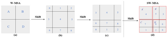 Window shift operation. (a) is an image composed of four small windows obtained through uniform segmentation by W-MSA. (b,c) are images showing different arrangements of the small windows obtained during the processing of SW-MSA’s shifting operations. (d) is the image obtained after the completion of SW-MSA’s shifting operation.