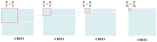 Compared to CNN-based feature extraction algorithms, the Swin-Transformer module does not alter the spatial resolution of the feature maps. CNN-based detection algorithms typically use convolutional kernels to increase receptive fields, which adds significant computational overhead during training and inference. In addition, excessively large convolutional kernels can decrease the spatial resolution of feature maps, resulting in the loss of fine-grained details and affecting the detection accuracy. Although stacking multiple small-sized convolutional kernels increases the receptive field, this approach significantly deepens network depth, complicates model architecture, and poses challenges for training and inference. However, the Swin-Transformer segments the input feature maps into multiple small windows, restricting the receptive field of each output feature to its respective small window. Figure 6 illustrates the segmentation of feature maps at different levels. As the hierarchy deepens, the size of the small window continues to shrink, gradually building a hierarchical structure. This module achieves the goals of expanding the receptive field, reducing the risk of information loss, and improving the accuracy of remote sensing objects’ detection without altering the spatial resolution of the feature map.