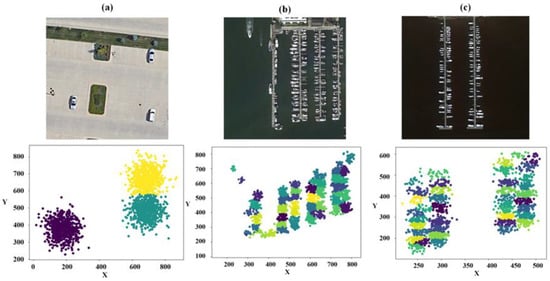 In the object detection stage, each image generates 2500 predicted candidate boxes. This paper uses the coordinate positions of the center points of these candidate boxes as a dataset and applies the adaptive dynamic K-Means clustering algorithm to cluster all predicted candidate boxes. This algorithm can identify the areas in which targets are distributed within the image, as shown in Figure 8. Figure 8a illustrates a scenario with a small number of sparsely distributed targets, while Figure 8b,c depict scenarios with a larger number of densely distributed targets.