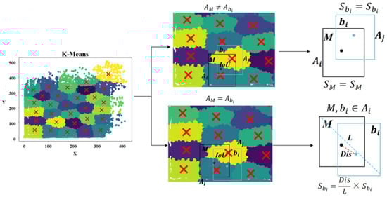 - If the center points of candidate boxes M and belong to different clusters, i.e., , M and are candidate boxes generated through the prediction of different targets. Therefore, the overlapping candidate box is retained, meaning its confidence value remains unchanged, as illustrated in the following Formula (11).