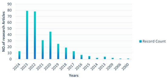 For this paper, we utilized the Web of Science (WOS) and Google Scholar as literature search tools, using “fracture”, “civil infrastructure”, and “computer vision” as search terms, and obtained 325 relevant papers. Figure 1 shows the distribution of relevant studies by year.