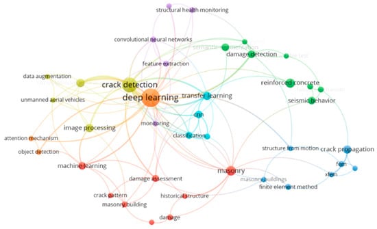 A keyword search was then conducted on the retrieved literature to identify frequent keywords related to the aforementioned terms. The keywords identified were ‘deep learning’, ‘crack detection’, ‘feature extraction’, ‘CNN’, and ‘image processing’, as shown in Figure 2.