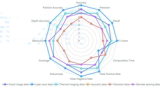 Multi-source data fusion involves integrating various information sources from different types or origins, such as images, sound, vibrations, under specific standards to logically combine them in spatial or temporal domains. This comprehensive analysis aims to accurately describe the condition of cracks, thereby enhancing the performance and accuracy of crack detection systems. By leveraging the strengths of multiple data sources, this approach overcomes the limitations of individual data streams, enhancing the reliability and precision of detection. It provides detailed and comprehensive crack information, supporting more accurate damage assessment and informed maintenance decisions. Figure 3 compares the performance of multiple data sources in crack detection to help select the most suitable data source or integrate various data sources.