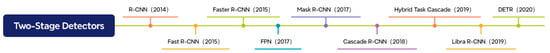 Two-stage detectors achieve higher detection accuracy by dividing the task into two separate stages. First, they generate region proposals, and they perform classification and bounding box regression on these proposals. Typical two-stage detectors include the R-CNN series (R-CNN [], Fast R-CNN [], Faster R-CNN []) and Mask R-CNN []. Figure 4 illustrates the evolution of two-stage detectors.