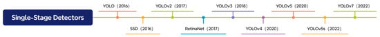 Single-stage detectors are a type of object detection method that directly predicts the class and location of objects in an image in a single forward pass. Unlike two-stage detectors, which first generate region proposals and then perform classification and bounding box regression, single-stage detectors accomplish both tasks simultaneously. This makes them faster and suitable for real-time applications. Common single-stage detectors include the YOLO (You Only Look Once) series [,,,,], SSD (Single Shot MultiBox Detector) [], and RetinaNet []. Figure 5 illustrates the development process of single-stage detectors.