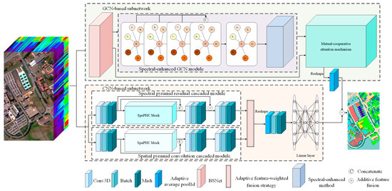 In this article, the proposed network includes two subnetworks: one is the CNN-based subnetwork, and the other is the GCN-based subnetwork, which includes a spectral-enhanced module and a mutual-cooperative attention mechanism. Specifically, we first reshape the features extracted from CNN subnetwork, and then a linear layer is utilized to yield the final classification performance of CNN subnetwork. Concurrently, the features extracted from the GCN subnetwork are reshaped. An adaptive average pooling layer is utilized to produce the final classification performance of the GCN subnetwork. Finally, an additive fusion strategy is employed to achieve the final classification results of PCCGC. Based on the above operations, the CNN-based features can be well integrated with the GCN-based features in an additive strategy for the HSI processing.