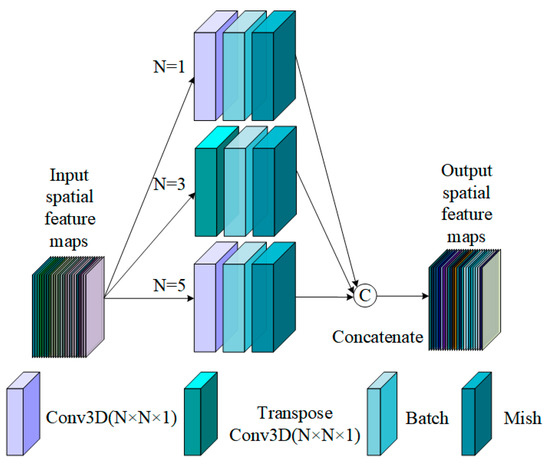 The proposed SpePHC, as shown in Figure 2, includes a pyramid architecture with different types of convolutional layers, featuring various sizes of kernels and varying numbers of output feature channels. The processed spectral feature maps , where indicates the th layer, are fed into the SpePHC block, then are processed in parallel by three different steps, e.g., , and . For , the are convolved by the 3D convolutional layer located at the bottom of the pyramid architecture, with the purpose of learning the spectral feature using a kernel size of This results in the spectral feature maps , which have an output dimension of . For , the are convolved by the 3D Transpose convolutional layer located at the middle of the pyramid architecture, with the purpose of learning the spectral feature using a kernel size of This yields the spectral feature map , which has an output dimension of . For , the are convolved by the 3D convolutional layer located at the top of the pyramid architecture, which uses a kernel size of The output dimensions of resulting spectral feature maps are . Then, we concatenate the three different spectral feature maps using the concatenate operation in the channel dimension, and the output spectral feature maps are obtained. The detailed operation process is shown in the following:
