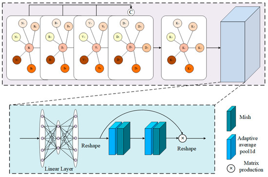 To obtain stable results, we execute the attention calculation process multiple times in parallel; here, it is executed eight times. Then, we reshape the , and the linear operation is used to project the reshaped attention score into . Subsequently, a softmax operation is performed. To enhance the important features, the residual connection is added on the . Subsequently, element-wise addition is used to concatenate the and the processed result of using softmax as well as . The process is shown as follows:
