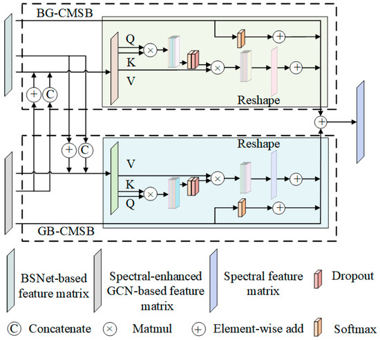 The proposal of this block is aimed at improving the transfer and expression of spectral signatures between BS-based feature matrix and GCN-based feature matrix . Given and are inputs to BG-CMSB. The BG-CMSB initially combines the and using the element-wise addition, resulting in the feature matrix . Then, is concatenated with to construct a new feature matrix. Next, the new feature matrix is separately multiplied with two different matrices, thereby linearly constructing the key and value simultaneously. At the same time, the is used, being multiplied with a weight matrix to linearly construct the query . Additionally, the , , and are all projection matrices. Then , , and the scale factor are processed by softmax, subsequently with , to calculate the cross multi-head self-attention score from to . Moreover, the scale factor is used to control the gradient of the model during the training process. The detailed overall operation is shown as follows: