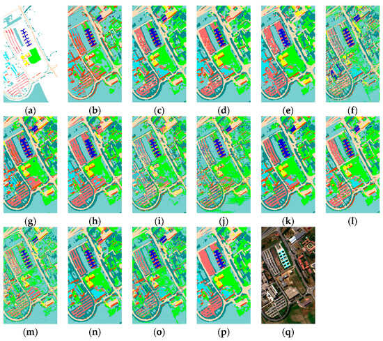 (1) Pavia University (PU) dataset: The PU is collected by using the ROSIS equipment over the University of Pavia, Italy, and its surrounding areas. The spatial area of the PU dataset is 610 × 340 pixels, with an approximate resolution of 1.3 m per pixel. The PU dataset in our experiment includes 103 spectral bands, spanning a spectrum wavelength from 430 to 860 nm. The quantities of samples for each class utilized in the training, validation, and testing sets are exhibited in Table 1.
