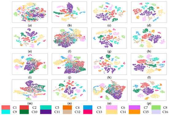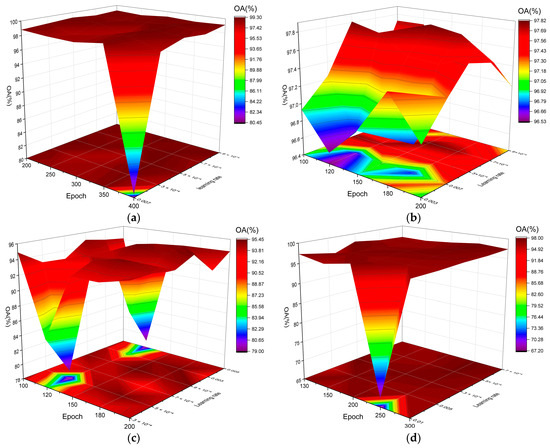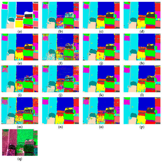 (3) WHU-Hi-Honghu (Honghu) dataset: The Honghu dataset is obtained in Hubei Province, China via imaging sensors mounted on a UAV platform. And, the Honghu dataset has a spatial size of 940 × 475 pixels, containing 270 spectral bands spanning from 400 to 1000 nm. In our experiments, only 16 categories are selected due to the limitations of the utilized device. The numbers of training, validation, and testing samples for each selected class, as well as the corresponding totals, are listed in Table 3.