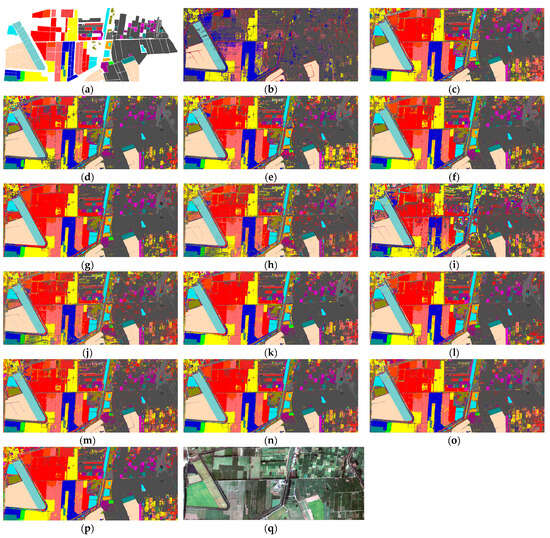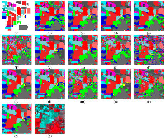 (4) Indian Pines (IP) dataset: The IP scene data is acquired using the Airborne/Infrared Imaging Spectrometer (AVIRIS) sensor over the Indian Pines area of northwestern Indiana. The spatial scale of the IP imagery is 145 × 145 pixels, consisting of 220 spectral bands ranging from 400 nm to 2500 nm. The IP image includes 16 categories, and the number of labelled samples for training, validation, and testing are displayed in Table 4.