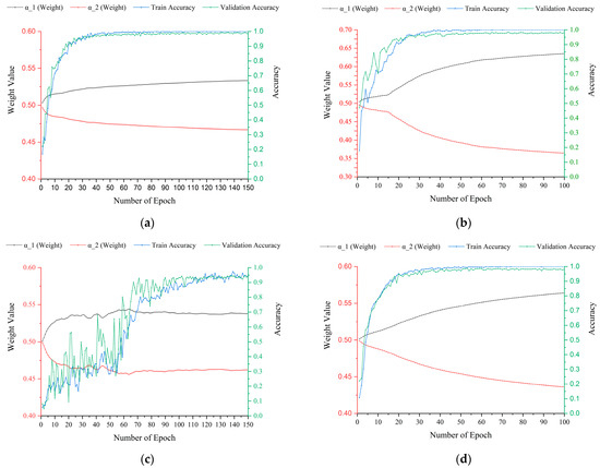 Considering the importance of the feature for classification results, the extracted multiscale spectral and spatial features play a significant but unequal role. Meanwhile, to fully harness the extracted spectral and spatial features, inspired by [56], the adaptive feature-weighted fusion strategy is employed. It can fuse the spectral signatures and spatial features adaptively. In this strategy, the extracted features located at the same location are added element-wise, aggregating information across spectral signatures and spatial features, thereby enhancing the features that are important to the classification accuracy. Meanwhile, to dynamically allocate weights, two different weight coefficients, namely, and , are used. To avoid the poor classification accuracy that could result from these two values being too large or too small, a softmax function is applied to adjust the values of and . Then, and will balance the spectral signatures and spatial features, enhancing the fusion of different information according to the impact of various features on classification accuracy. The detailed operation is illustrated as follows: