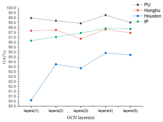 To demonstrate the robustness of the CNN-based subnetwork to the complete model, we remove the CNN-based subnetwork; as shown in Figure 16, the OA of model_4 is lower than that of model_0 on the four widely used HSI data scenes. Meanwhile, the OA of model_4 is lower than others on the model axis; especially on the IP data scene, the OA of model_4 is much lower than model_0. And, the limited feature extraction ability of the GCN-based subnetwork is also shown.