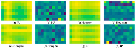 To validate the effectiveness of the proposed spectral-enhanced GCN modules, the heatmaps of features before and after using the spectral-enhanced GCN module are shown in Figure 17. Taking the PU data scene as an example, we randomly chose a 9 × 11 pixel region from the spectral matrix to show the features contained in the spectral matrix. From Figure 17a, it can be seen that the image has lighter color, especially in the range of lighter green, and each pixel does not show significant differences. It shows that the features within a certain region before using the spectral-enhanced GCN module have weak differences. Conversely, from Figure 17b, it can be seen that the heatmap displays darker colors, with different darker shades among pixels for different classes. According to Figure 17b,d,f,g,h, the features within the feature matrix are accentuated, which demonstrates the effectiveness of the proposed spectral-enhanced GCN module. On the Houston, Honghu, and IP datasets, Figure 17c,e,g shows that the feature matrices display relatively lighter colors. In contrast, Figure 17d,f,h present relatively darker feature maps, which are processed by the spectral-enhanced GCN module. These heatmaps exhibit more pronounced differences between pixels of different classes, highlighting the significant features in the feature map.