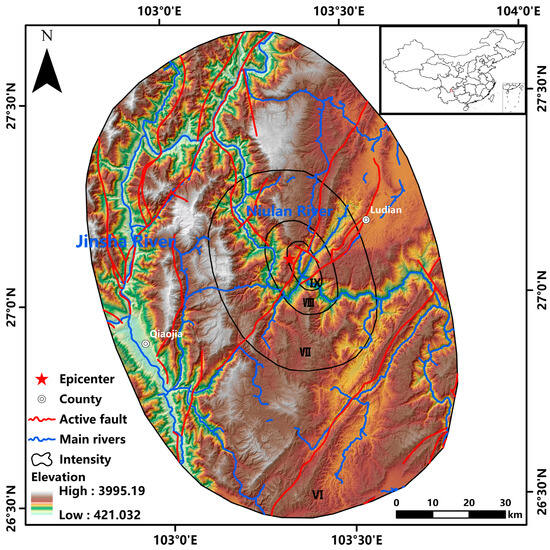 On 3 August 2014, a magnitude 6.5 earthquake struck Ludian County, Zhaotong City, Yunnan Province, China, with the epicenter located at 27.10°N, 103.34°E (Figure 1). This seismic event triggered a substantial number of coseismic landslides, exceeding 10,000 in total, with a combined area of 15 square kilometers [11]. The maximum intensity in the earthquake-affected area was nine on the seismic intensity scale (Figure 2). Seismic intensity refers to the degree to which the ground and various buildings in a certain area are affected by an earthquake. After an earthquake occurs, the seismic intensity in different areas away from the epicenter is evaluated based on the degree of building damage and changes in the ground surface, and equal intensity lines are drawn as a description of the degree of damage caused by the earthquake. Therefore, seismic intensity mainly indicates the degree of impact of earthquakes that have occurred [11]. The earthquake zone is situated in the lower reaches of the Jinsha River Basin, and the Niulan River traverses the earthquake area. This study utilizes the Ludian Earthquake Landslide Database, which includes 10,559 coseismic landslides induced by this earthquake (Figure 3) concentrated within the zones assigned intensity ratings of eight or nine [12]. Using the landslide interpretation area as the study area, this study introduces excess topography as a geomorphological indicator to explore its impact on the distribution of seismic landslides. Furthermore, to meet practical needs such as hydropower engineering planning, the input parameters were improved using a simplified Newmark model. The results include the regional landslide susceptibility distribution and earthquake landslide hazard zoning.