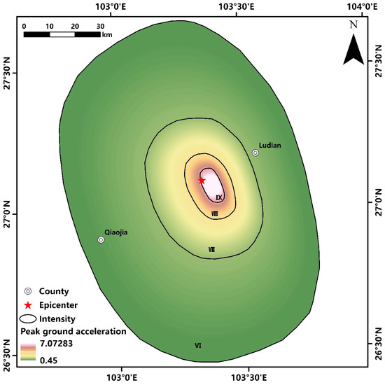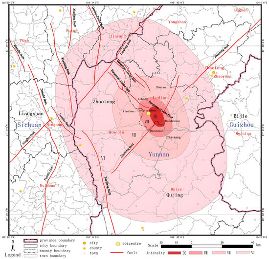 Map showing the seismic intensity distribution of Ludian earthquake (the source from the China Earthquake Administration, https://www.cea.gov.cn/cea/dzpd/dzzt/3571618/3571619/3577650/index.html), URL (accessed on 6 March 2024).
