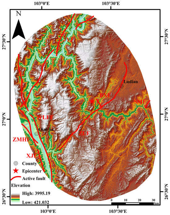 The Ludian Mw6.2 earthquake occurred at the eastern margin of the Qinghai-Tibet Plateau, east of the Sichuan Yunnan block, in the central southern section of the north-south seismic belt [13]. This earthquake was a moderate intensity earthquake that occurred on the deformation zone of the interaction boundary between the eastern edge of the Qinghai-Tibet Plateau and the South China Block, where the Sichuan Yunnan rhombic block moved in a southeast direction [14]. The Cenozoic tectonic deformation is strong here, with active faults of different orientations, and multiple earthquakes have occurred [15,16,17]. Figure 4 shows the distribution map of active structures in the region. The main controlling deep faults in the region are the north-northwest trending sinistral strike slip Zemuhe and Xiaojiang faults. There is also a series of small faults developing inside these fractured blocks. Northwest trending faults have also developed in this area, with the Zemuhe and Xiaojiang faults running from west to east.