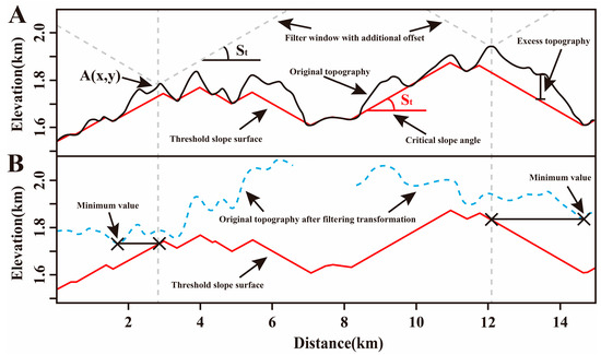 Map showing the schematic diagram of the process of calculating the excess topography (image modified from Blöthe et al. [29], (A) is original topography, (B) is threshold slope surface).