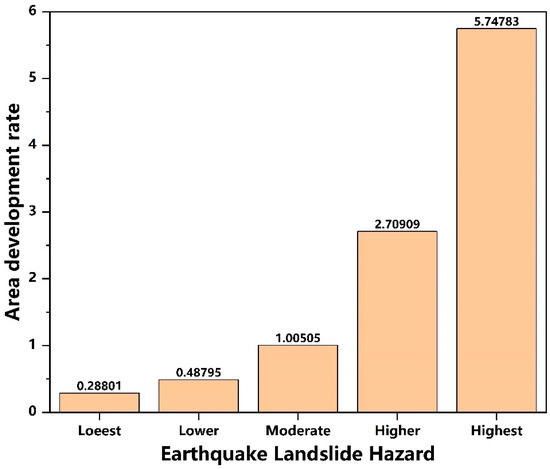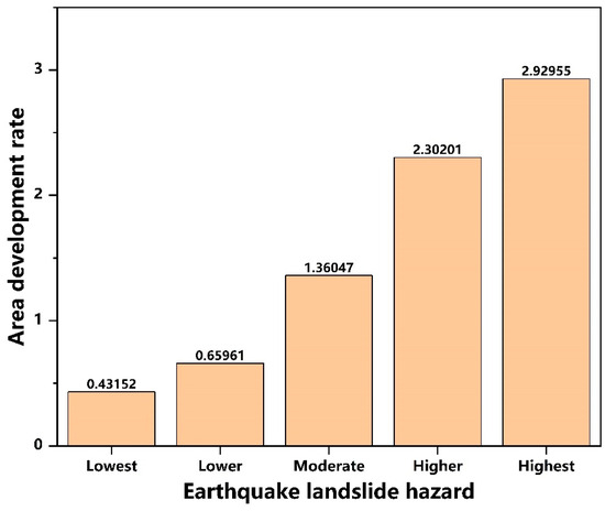 By calculating the seismic landslide area development rates for different hazard zones (Figure 18), it was found that the development rate in the moderate hazard zone is approximately 1. This indicates that the moderate hazard zone represents the average level of landslide development under the current seismic conditions in the study area. In the extremely low hazard zone, the development rate is only 0.29, while in the low hazard zone, it is 0.49. These two areas are less prone to landslides in the study area for this earthquake. In contrast, the development rate in the high hazard zone is 2.71, and in the extremely high hazard zone, it reaches 5.75. This shows that these two zones are highly prone to landslides in the study area for this earthquake, with the extremely high hazard zone being particularly susceptible to landslides. This seismic hazard prediction result can provide valuable reference and suggestions for emergency response and post-disaster reconstruction efforts.