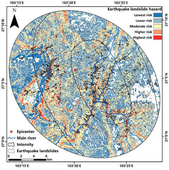 Based on the conversion method between seismic intensity and peak ground acceleration (PGA) for the Ludian earthquake (Table 6) [42], the PGA distribution map for this event was obtained (Figure 16). Using this information and the landslide susceptibility calculations, the earthquake landslide hazard distribution map for the Ludian earthquake study area was created (Figure 17), categorizing the hazard into five levels: extremely high risk, high risk, moderate risk, low risk, and extremely low risk. The area proportions for each hazard zone are 10.33%, 43.06%, 31.77%, 13.57%, and 1.28%, respectively. The results show that on both sides of the rivers in the southeast of the epicenter, within the IX intensity zone, the earthquake landslide hazard is generally extremely high. Relatively large landslides are densely distributed in this area. The relatively higher risk zones are almost aligned along the riverbanks. Similarly, in the upstream area of the Niulan River to the west of the epicenter, the hazard is also relatively high with a dense distribution of landslides.