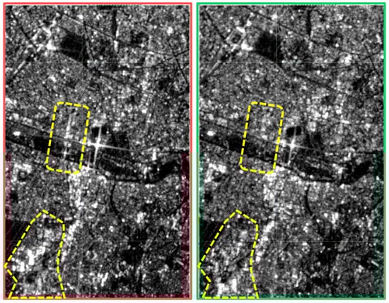 Figure 2 provides a visual representation of this phenomenon depicting two images of ascending data captured over Paris, with different incident angles (The incident angle is the angle between the incoming radar beam and a vector perpendicular to the target [36]). It can be observed that the backscatter values, the shape of the building blocks, and SAR artifacts are different in these two samples of data. In order to address the issue of indeterminate solutions, a set of rules on the selection of the Region of Interest, orbit number, and despeckling was established to constrain the possible outcomes, aiding the GAN model in generating a unified answer for the translation. The following sections will provide a more detailed explanation of how each of these rules has been implemented.