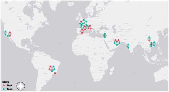 SAR data are subject to significant influences from the Earth’s relief [37]. In regions where the relief exhibits high variance, such as hills and valleys, SAR data can be affected by foreshortening, layover, and occlusion. To avoid these issues, we chose to limit the Regions of Interest (ROIs) to urban areas, which are generally flat and exhibit low relief variance. The ROIs were selected using the Onera Satellite Change Detection (OSCD) dataset [38], which includes 24 urban areas from around the world. Of these, 14 were designated for training, and the remaining 10 were reserved for testing. The OSCD dataset was originally developed for change detection analysis of Sentinel-2 data.