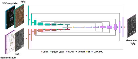 Furthermore, the importance of data in each stream can spatially vary. For example, the model might need to utilize the data of unchanged areas from the Sentinel-1 data while reconstructing the data of changed areas from the optical Sentinel-2 data. To help the model to better focus on different parts of each Sentinel-1 or Sentinel-2 stream, we implemented the Global–Local Attention Module (GLAM) [54] at the downstream features of both encoder streams in the generator model.