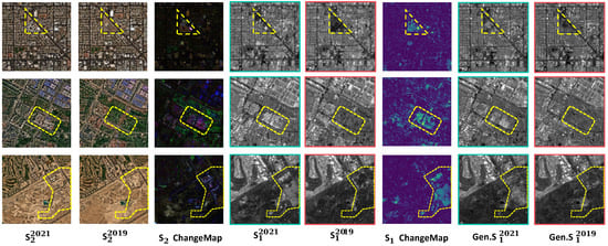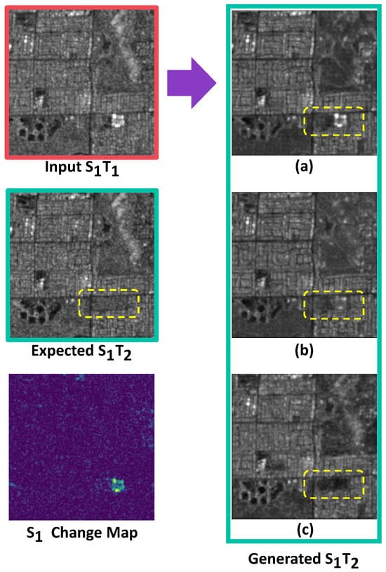 Additionally, as an input-level domain adoption method [66], our approach addresses the domain gap at the input level of SAR–Optical change detection models, reducing the need for more complex change detection models. Our approach enables the temporal expansion of the SAR time series even before the satellite mission’s start, allowing for the generation of SAR data for periods preceding the satellite’s operational timeline. This capability utilizes existing optical image datasets, thereby minimizing the need for new, time-consuming, and costly data collection efforts.
