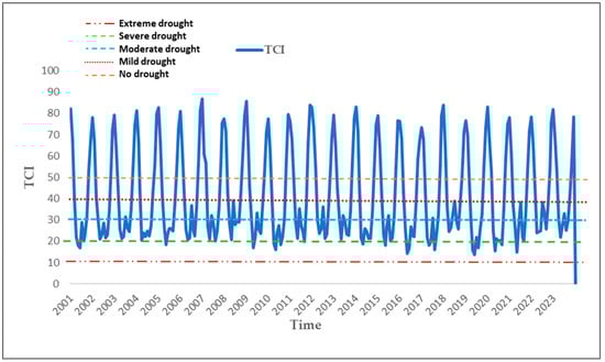 - The results of the TCI index values over the study period exhibit variations over time, with notable minimum observed values in specific years (2001, 2005, 2009, 2010, 2014, 2015, 2016, 2017, 2019, 2020, and 2021); this indicates periods of more severe temperature conditions in the study area during those years []. The TCI index values trend shows an increase in temperature in the years 2014 to 2023 compared to the years 2001 to 2013; this trend suggests a worsening of temperature conditions over the years, which can have implications for the study region’s environment and ecosystems []. The TCI mean values throughout different years ranged from 18.9 to 80.9, indicating the varying severity of drought conditions over time. Therefore, the analysis provides valuable insights into the impact of temperature conditions on drought dynamics in the Najd region, emphasizing the importance of considering multiple factors in assessing drought conditions through indices such as TCI and VCI indices []. Song et al. (2018) [] used MODIS-based indices to study drought conditions in China. Their findings highlighted how extreme temperature conditions, reflected by low TCI values, were crucial for understanding drought dynamics and impacts on agriculture. This supports the observation that minimum TCI values signify critical temperature stress periods.