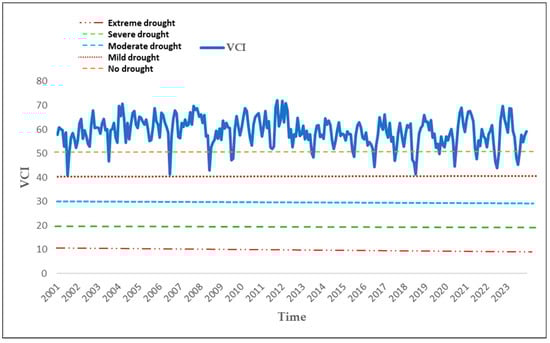 where NDVImin and NDVImax are the historical minimum and maximum of NDVI values, respectively. Values of the VCI index ranged from 0 to 100, with higher values indicating better vegetation conditions. VCI effectively normalizes NDVI, making it a robust indicator for drought assessment by identifying deviations from normal vegetation conditions.