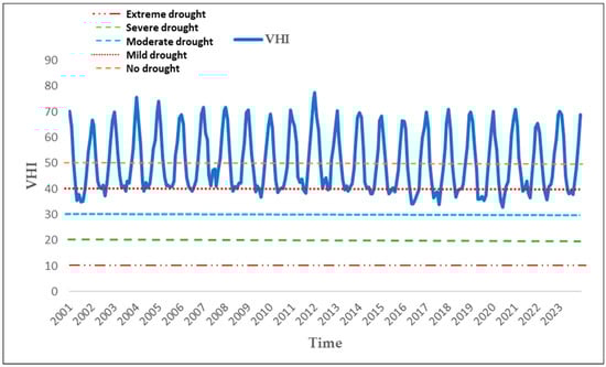 - According to VHI index spatial distribution maps, all studied years (with the exception of 2005 and 2007) were classified as moderate drought years, and the mean VHI values ranged from 36.6 to 70.5 throughout the study period. Based on Jalayer et al. (2023) [], the VHI index results underscore the persistent nature of drought conditions in the Najd region, with a noticeable escalation in severe drought events in the latter years of the study period. The spatial and temporal analysis of VHI provides valuable insights into the evolving drought patterns in the region, emphasizing the need for effective mitigation and adaptation strategies to address the heightened risk of drought in the study area [].