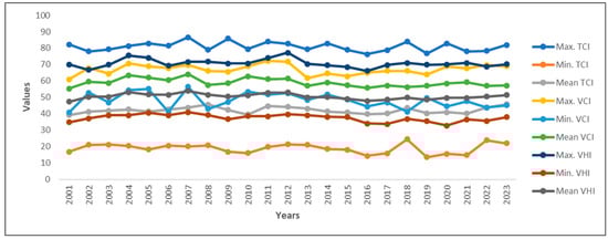 Figure 8 provides a summary of the maximum, minimum, and mean values of the TCI, VCI, and VHI indices in the Najd region on an annual period from 2001 to 2023; this figure highlights severe drought events for TCI mean values in the years 2001, 2005, 2009, 2010, 2014, 2015, 2016, 2017, 2019, 2020, and 2021. Mild drought conditions were noted based on the mean values of the VCI index in the years 2001, 2003, 2006, 2008, 2009, 2013, 2015, 2016, 2017, 2018, 2020, 2021, 2022, and 2023. In contrast, moderate drought events were noted for VHI mean values across all studied years except for 2005 and 2007.