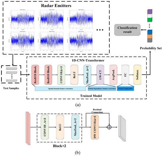 As shown in Figure 3a, the neural network architecture proposed in this article consists of three main modules. First, the convolution module is used to extract the spatial domain features of the radar signal. Next is the LW-CT module, which is responsible for extracting the global information of the data in the signal sequence and the signal timing logic information. Finally, the fully connected layer module is used to splice data, fuse features, and input the classification results into the softmax function. These three main modules are connected in a cascade manner, which improves the network training efficiency and network performance. In addition, this method can effectively reduce the risk of overfitting of the network during training.