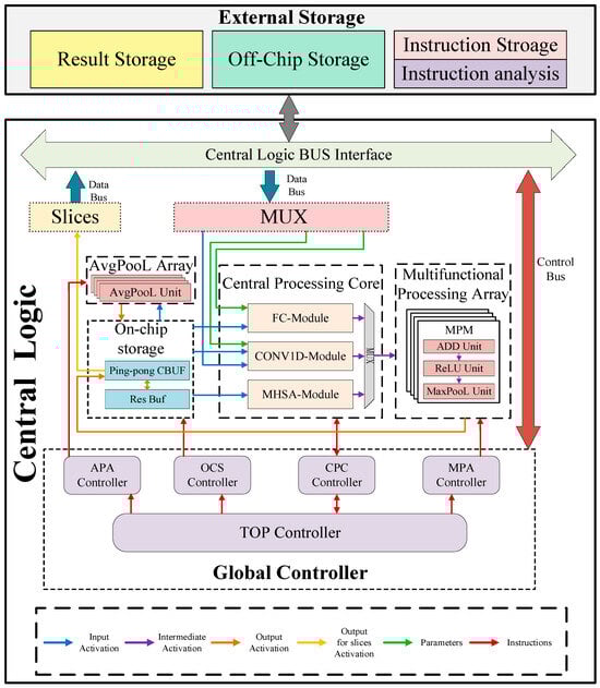 In this section, we will introduce the hardware architecture of Central Logic in Figure 1. As shown in Figure 5, it is the top-level structure of Central Logic. It mainly consists of an average pooling array (APA), a central processing core (CPC), a multifunctional processing array (MPA), and the on-chip storage (OCS). In order to distinguish different data types, we use arrows of different colors to represent them.