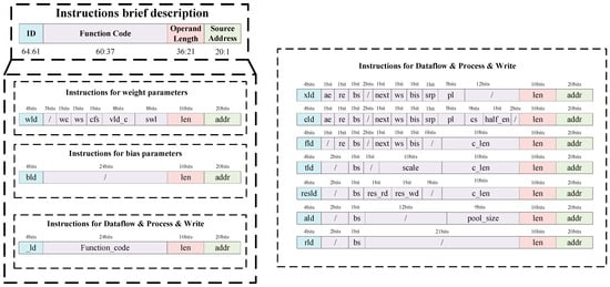Figure 6 shows the encoding composition of the instruction, where ID is responsible for distinguishing the loading data stream and parameter stream, and turning on the corresponding submodule working switch. Source Address is in charge of notifying the address of the off-chip storage or on-chip storage to load parameters or data. Operand Length takes responsibility for notifying the relevant storage unit of the size of the current loaded data stream. Function Code is responsible for notifying the relevant module to perform the corresponding operation.