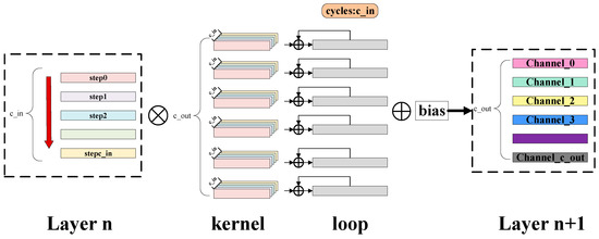 Figure 8 shows the processing flow of the convolution layer in the hardware architecture. The calculation rule of the convolution operation module is to first calculate the single-channel convolution results of all convolution kernels, and then add the corresponding results of all channels through a loop and add the bias parameter to obtain the final output result of the convolution layer.