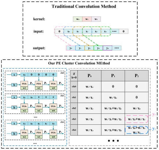 Next, we analyze the throughput advantage of this architecture from a mathematical perspective. Assuming the clock frequency is Hz, the input length of a convolutional layer is , the convolution kernel length is , the number of input channels is , and the number of output channels is . Based on the two-stage pipeline architecture proposed in this article, the throughput of this architecture for the convolutional layer can be described in Equation (12)